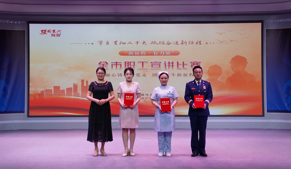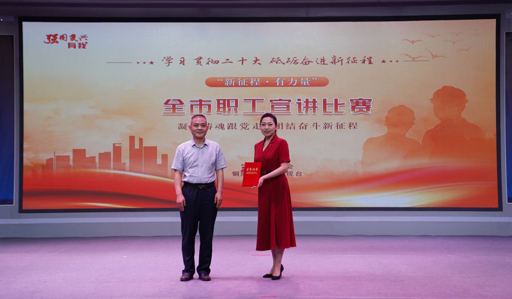 为深入学习贯彻党的二十大精神,广泛开展“中国梦·劳动美––凝心铸魂跟党走 团结奋斗新征程”主题宣传教育活动,充分展示新时代职工朝气蓬勃、昂扬向上的精神风貌,激发广大职工爱岗敬业、岗位建功的热情,6月16日下午,“新征程·有力量”全市职工宣讲比赛决赛在市广播电视台成功举办。市人大常委会副主任、市总工会主席陈昌生,市总工会党组书记、副主席何民主,市委宣传部副部长查正飞,市总工会二级调研员、党组成员、副主席吴蒲江,中共铜陵市委讲师团团长殷红卫,铜陵市广播电视台党组成员、副台长黄文源等领导现场观看比赛,并为获奖选手颁奖。