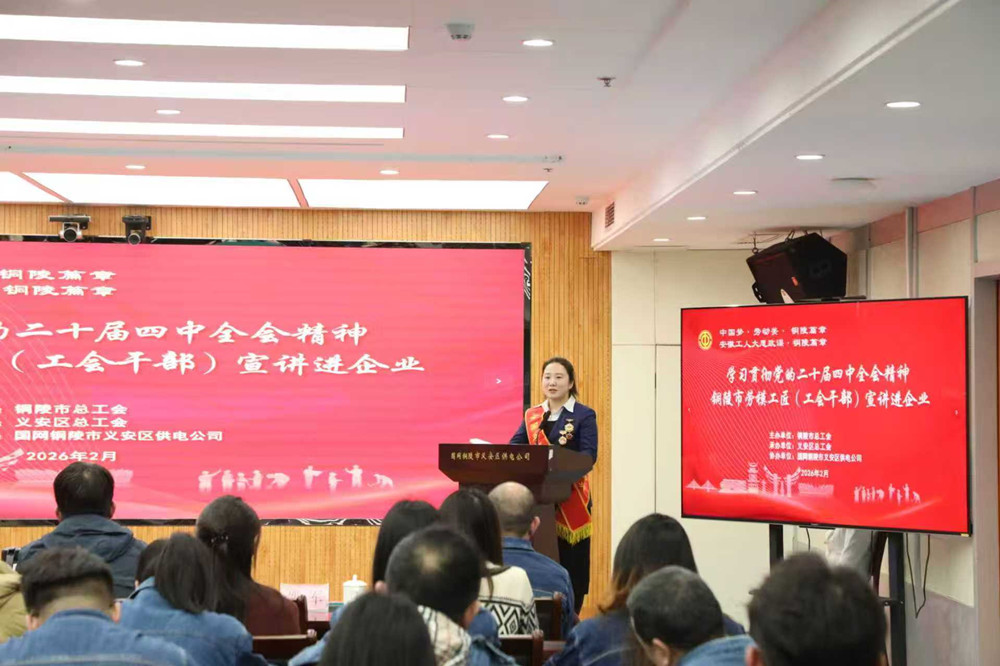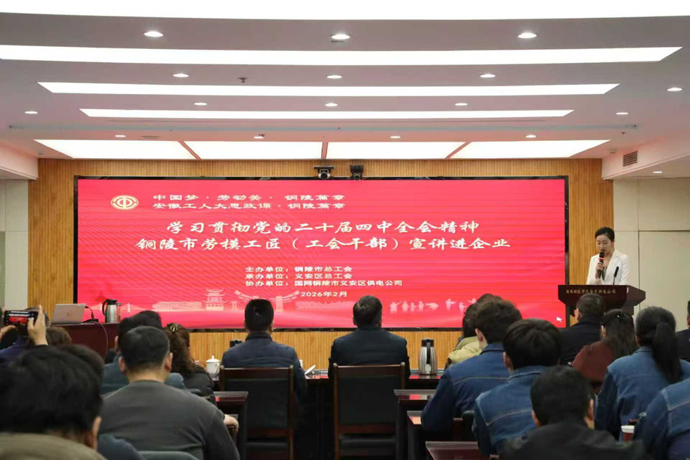2月3日,“学习贯彻党的二十届四中全会精神 –– 市劳模工匠(专家学者、工会干部)宣讲进企业”活动在国网铜陵市义安区供电公司举行,以理论宣讲+榜样分享的形式,推动全会精神落地生根。市总工会党组书记、副主席黄文进,市总工会副主席张昊以及相关单位负责人、部分企业职工代表、新就业形态劳动者代表近百人参加活动。