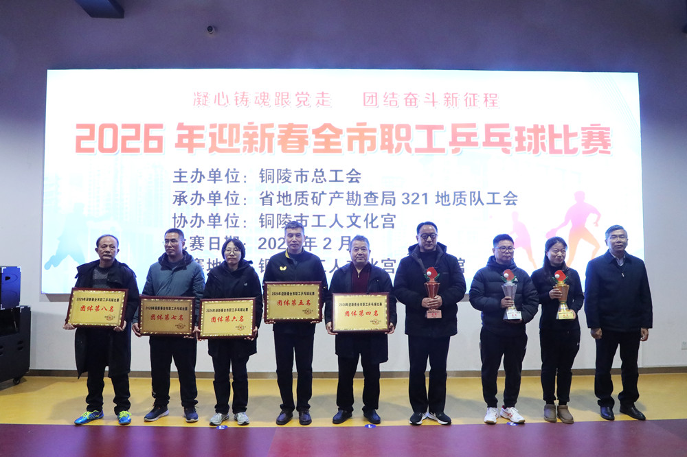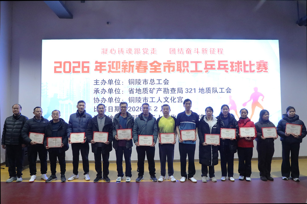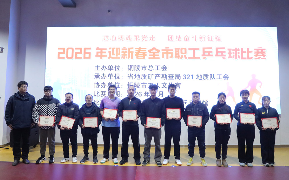 为丰富职工新春文化生活,营造欢乐祥和的节日氛围,凝聚高质量发展合力,近日,铜陵市总工会主办的2026年迎新春职工乒乓球比赛在市工人文化宫圆满落幕。市总工会党组书记、副主席黄文进,市总工会副主席张昊,安徽省地质矿产勘查局321地质队纪委书记金必武出席活动。